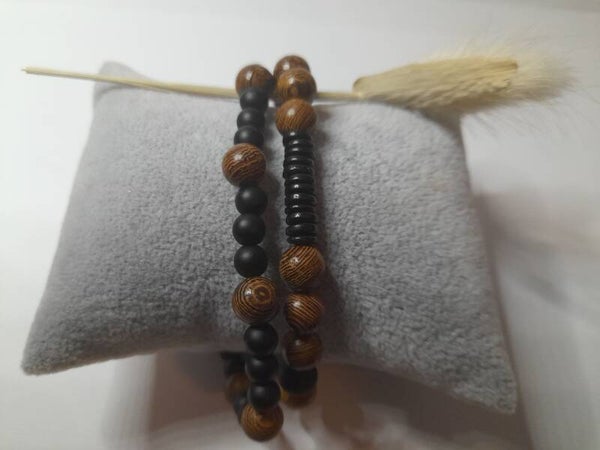 Deze Heren Armband is gemaakt van elastiek en heeft onyx kralen en houtlook kralen.